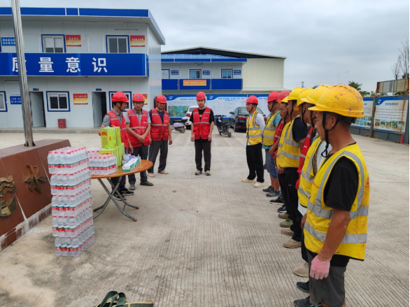 活動(dòng)現(xiàn)場,臨時(shí)黨支部成員與項(xiàng)目部工作人員化身“清涼使者”,將藿香正氣水、王老吉涼茶、礦泉水等防暑降溫物資一一遞到工人手中。“天氣炎熱,一定要注意防暑,合理安排作業(yè)時(shí)間!”他們一邊發(fā)放物資,一邊反復(fù)叮囑工人們做好自我防護(hù),科學(xué)調(diào)整作息,確保安全生產(chǎn)。接過物資的工人們臉上洋溢著笑容,紛紛對這份及時(shí)的關(guān)懷表示感謝。